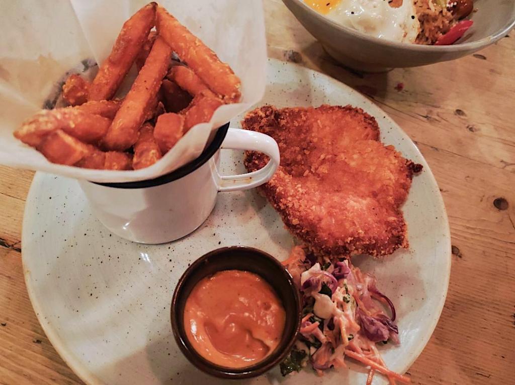 On from that, for him, Buttermilk Fried Chicken – plump, tender, beautifully seasoned and properly crispy – with chipotle mayo, superb slaw and skin-on fries; a proper, Big Boy treat. For me, Nasi Goreng – and how often do you see that on a downhome, casual dining menu? I’m guessing that the chef behind the menu at the Lounge chain made darn sure that both the Kecap Manis and shrimp paste required to make NG the depth-charge, uniquely flavoursome fried rice dish made it into this dish – mine certainly tasted as though they did. It was laden with chicken and prawns too, and plenty of chilli, and generous smatterings of sesame seeds. My only niggle was that the all-important fried egg on top of the rice should, to my mind, have been runny. But on further research, William Wongso – Indonesia’s foremost celebrity chef, don’cha – says that’s not necessarily the case, so I stand corrected… and I’d definitely return to Velo Lounge for this dish alone, ‘cos as far as I know, there ain’t nowhere else I’m going to get a thoroughly decent Nasi Goreng in Bath.