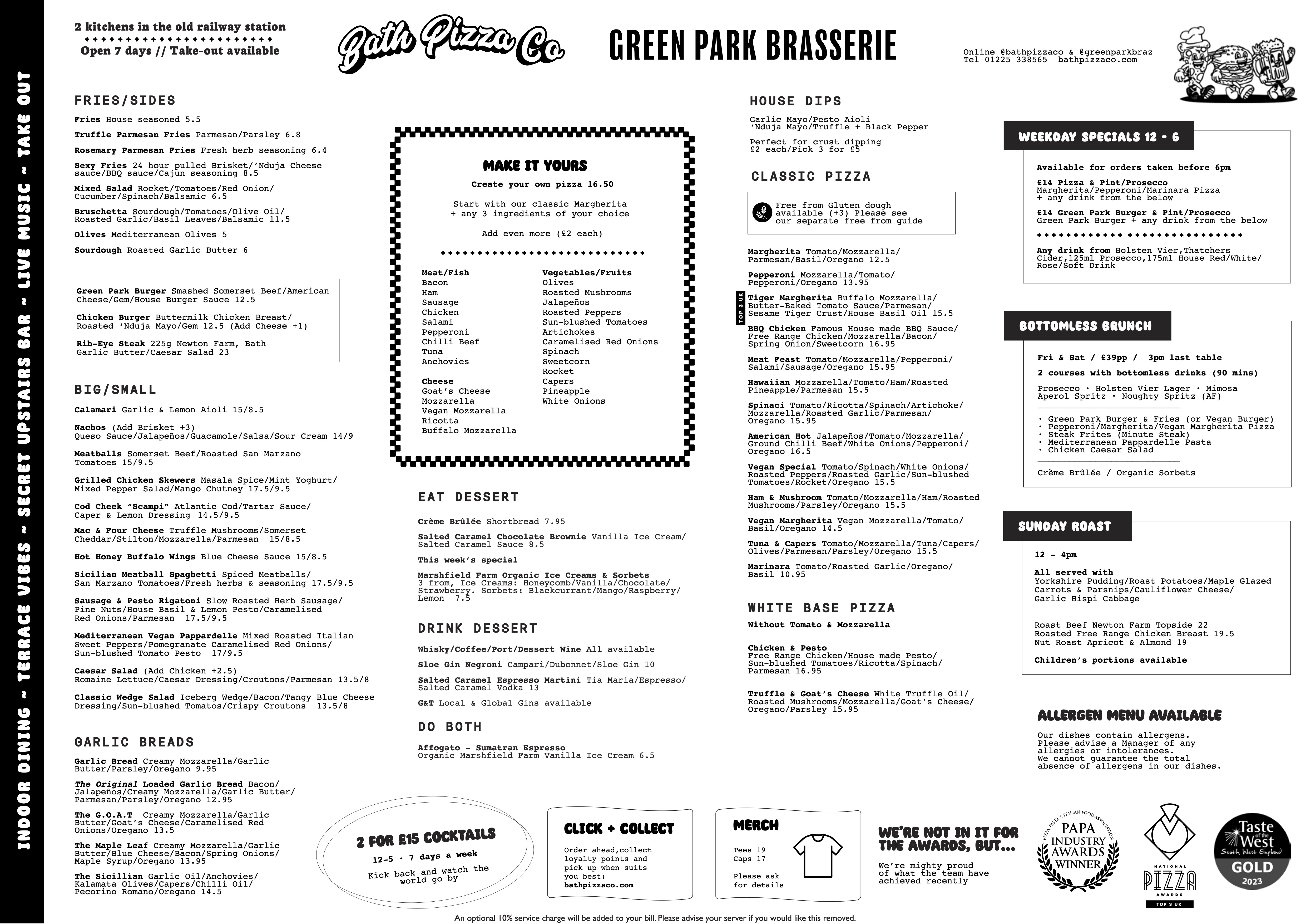 And so it came to pass that Bath Pizza Co and Green Park Brasserie menus have merged to become one and the same thing. Put ’em together and what have you got? A thoroughly tempting, tastefully dizzying array of plates in small or large format supplemented by, of course, those pizzas from the Margherita to the Marinara with specials, ‘make it your own’ and the white base variety (that I personally adore) grabbing our attention along the way.