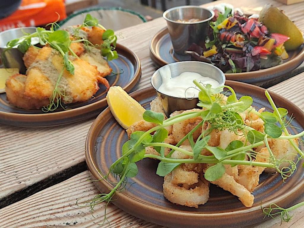 We ate Cod Cheek “Scampi”: moist, chunky jewels of the freshest, fattest cod cheeks in perfectly crispy batter drizzled with a caper and lemon dressing and served with an exceedingly moreish tartare sauce; if you upgrade your portion from small (£9.50) to large plate (£14.50) and order a portion of fries to go with it, you’ll soon be waxing lyrical about how you’ve ‘discovered’ a whole new version of the best fish and chips in Bath. We had the small plate version of grilled chicken skewers too, all properly gnarly-chargrilled on the outside and super-soft within, accompanied by a masala-spicy/minty yoghurt, a sweet/tangy mango chutney and a mixed pepper salad. And oh, the Calamari! A starter/small plate tradition for me every time I visit the Braz that I’ve re-ordered multiple times for very good reason; ’nuff said?