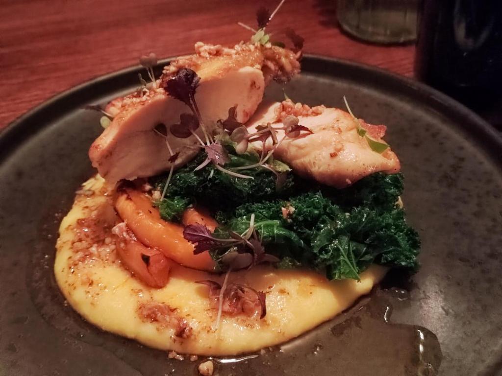 For mains, soft, slow braised pork belly, satisfying fatty but not overwhelmingly so, served with an earthy, perfectly balanced black pudding mash, brassy, mineral-rich cavolo nero, a complex red wine and apple jus (kinda, gently tannic meets softly fruity) and shards of perfect crackling. I, meanwhile, swooned into my sweet, moist chicken breast that itself swooned into a pool of creamy polenta, a nutty walnut dressing tethering the sweetness of a tumble of honey-roasted butternut squash to a deeply umami foundation.