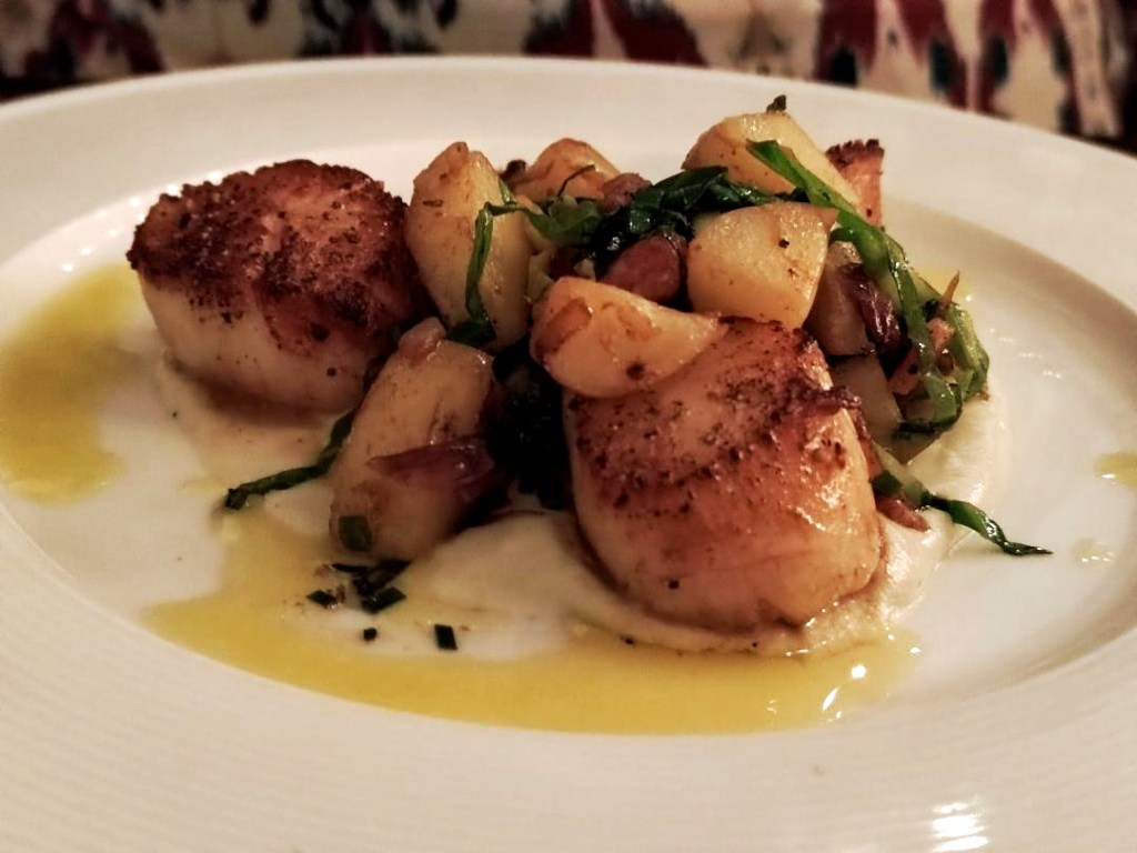 From the get-go, our starters exemplified Sam’s modus operandi: a beautifully seasoned, super-savoury, distinctly non-dry Pork Terrine rich in textured contrast, with fruity/tart golden raisins adding spritzy points of interest along the way; plump Brixham scallops paired with a sublimely smooth cauliflower puree, chubby little morsels of bacon, smoky hispi cabbage and creamy new potatoes.